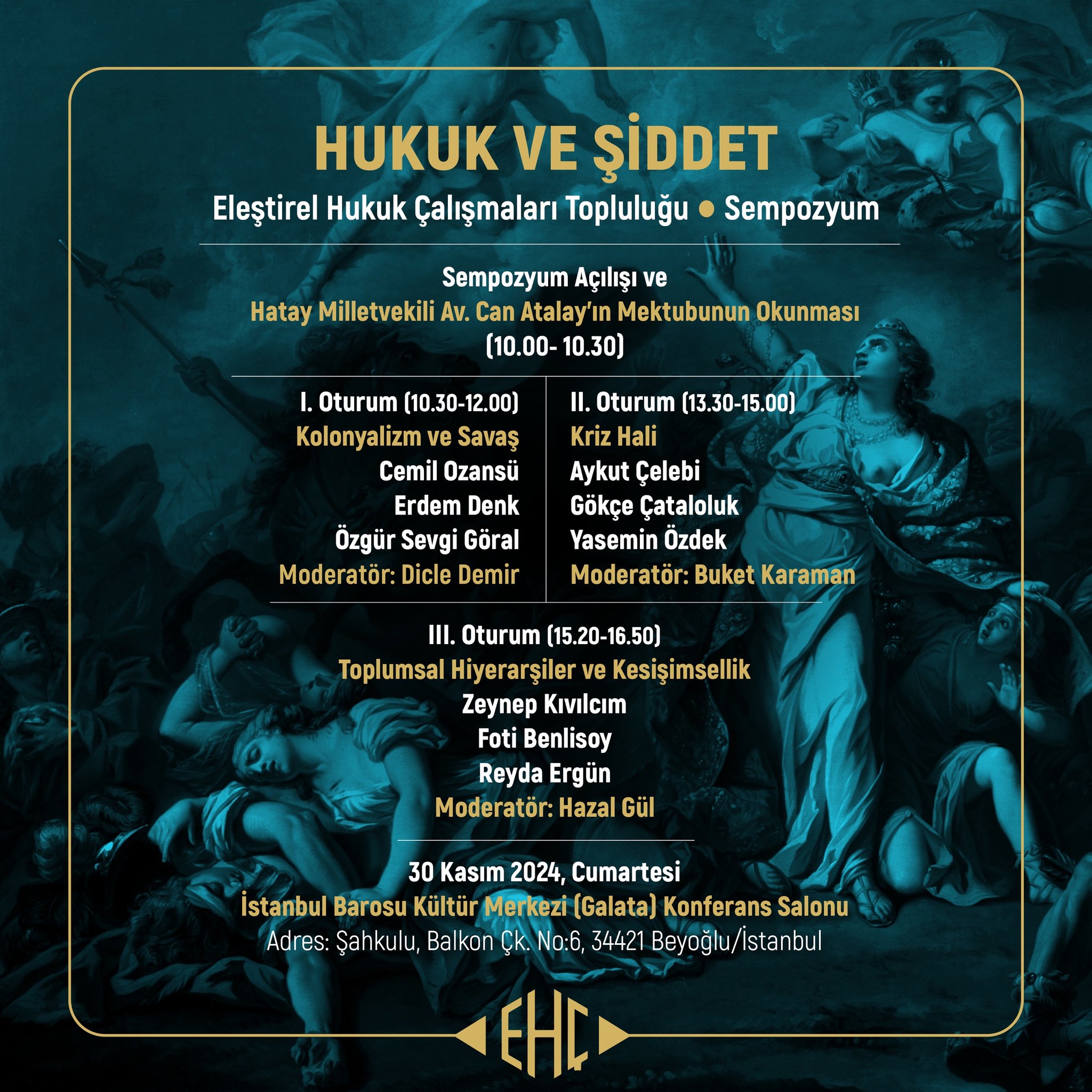 Eleştirel Hukuk Çalışmaları Topluluğu olarak düzenlediğimiz sempozyumların ikincisi bu kez İstanbul’da, 30 Kasım 2024 tarihinde İstanbul Barosu Kültür Merkezi Konferans Salonu’nda gerçekleşti. Çağrı metnimizde de belirttiğimiz üzere; “bu yılki Sempozyum’un temasını tartıştığımız dönem İsrail’in Gazze’de gerçekleştirdiği soykırım ve bölgeselleşen saldırıları gündemdeydi ve halihazırda gündemde olmaya devam ediyor. Diğer taraftan da otoriterleşmenin dünya çapında gittikçe arttığı ve bunun hukukla şiddet arası ilişkilerde, daha doğrusu hukukun bir şiddet olarak işleyişindeki yansımalarını daha aşikâr şekilde görüldüğü bir tarihi momentten geçiyoruz.”